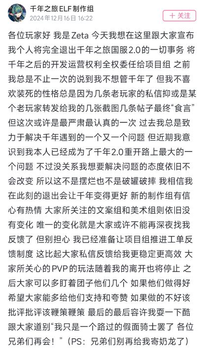 由于PVP事件怼玩家事件愈演愈烈,宣布退出千年之旅国服2.0一切事务