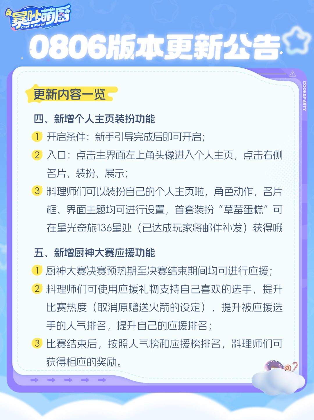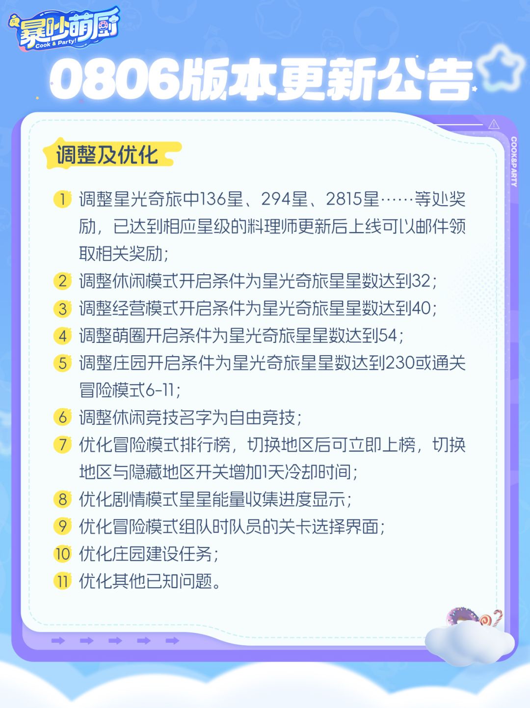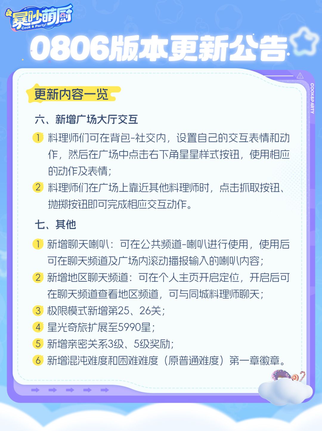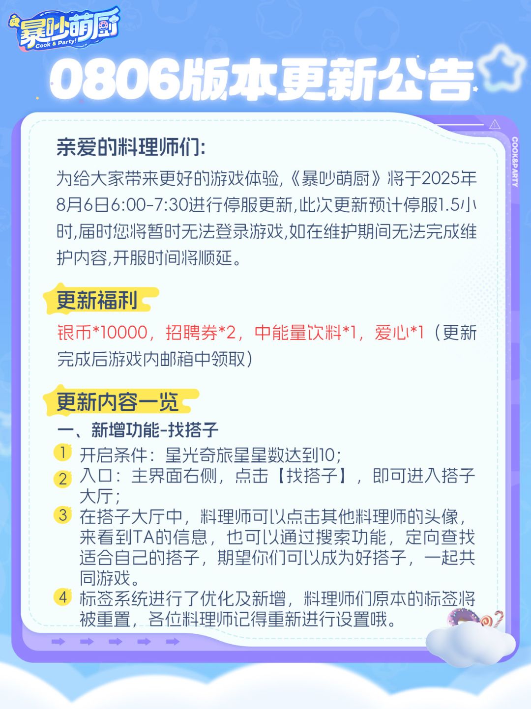 为给大家带来更好的游戏体验,《暴吵萌厨》将于【2025年8月6日6:00-7:30】进行停服更新,此次更新预计停服1.5小时,届时您将暂时无法登录游戏,如在维护期间无法完成维护内容,开服时间将顺延。