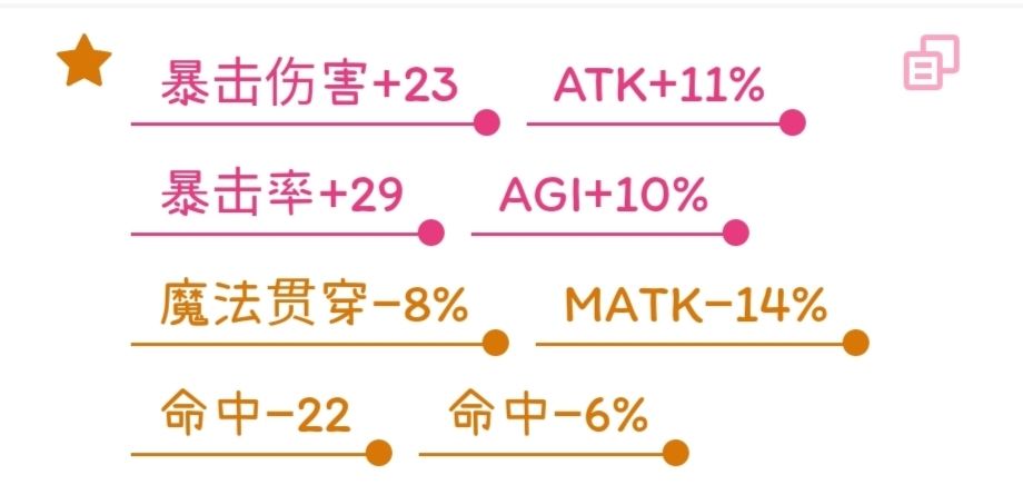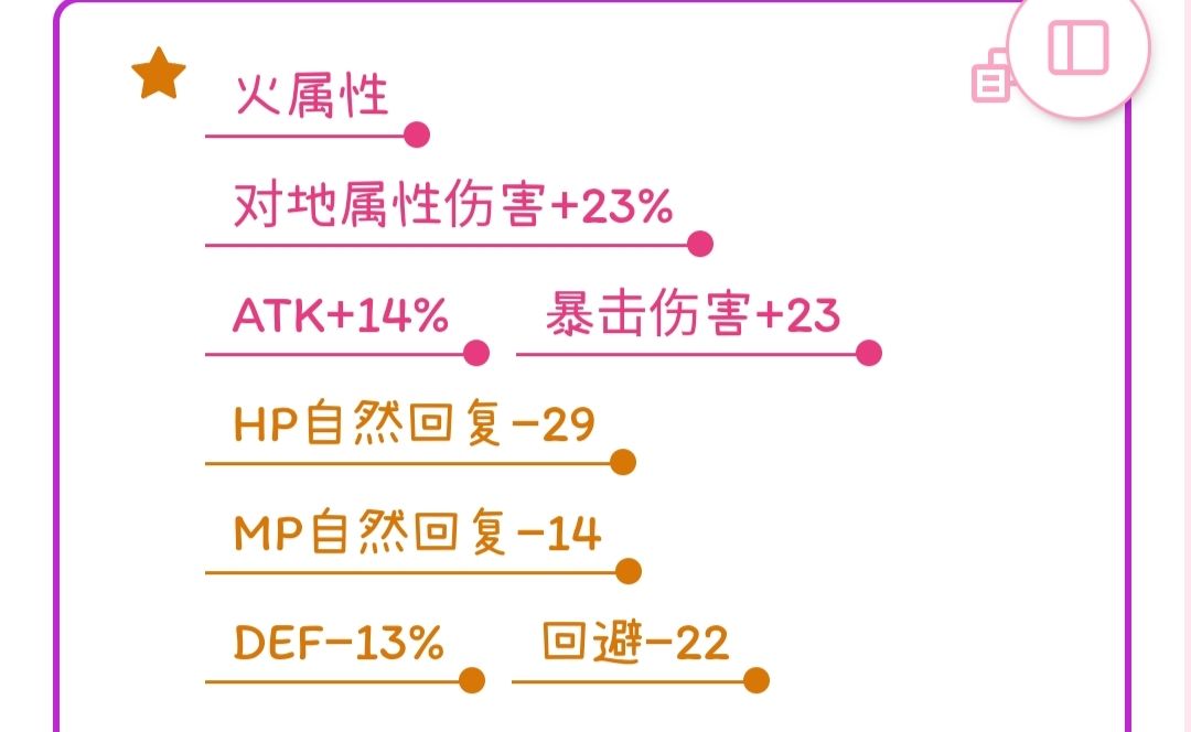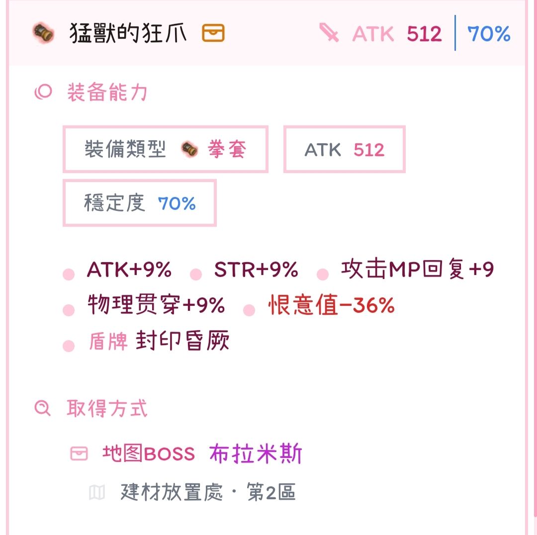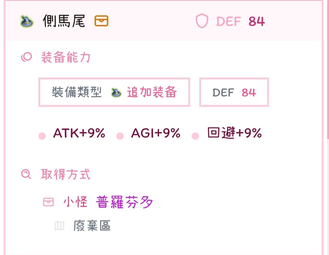爱猫爪护卫喵:物理攻击+10%,敏捷+4%,攻击mp回复+2,异常抗性+2%,体力值上限-12%(第二大敏职加伤王石,小贵)