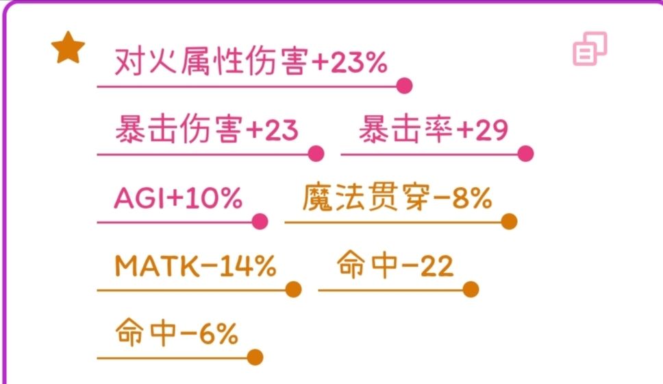 卡斯蒂利亚:12%近距离威力,6%远距离威力,10%命中,-900攻速,装备魔导具加5%行动速度,装备忍术卷轴+10%魔法贯穿(不缺攻速可以用,可以把邪雷换掉,但是就得吃个魔壶或者戈尔多,爱德华兹,熊拳三选二了,这样才不影响初始手感)