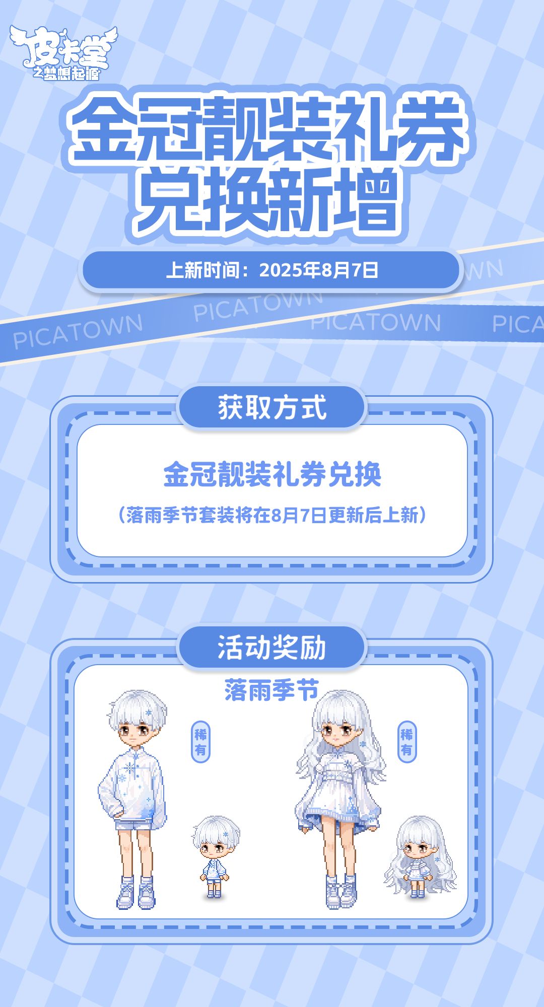 -【金冠兑换】稀有套装「落雨季节」将在8月7日上架金冠商城,购买金冠可获得兑换道具靓装兑换券。