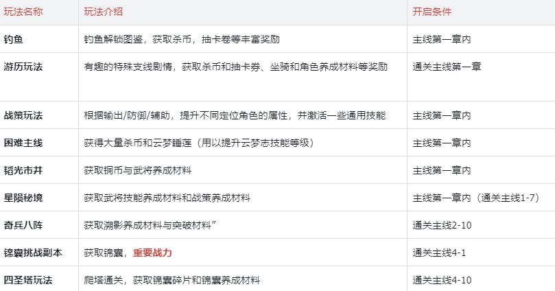 - 前期的主要提升方向是战策和角色养成,建议优先刷取奇兵八阵的战策和角色养成材料,不要把体力用在锦囊刷取