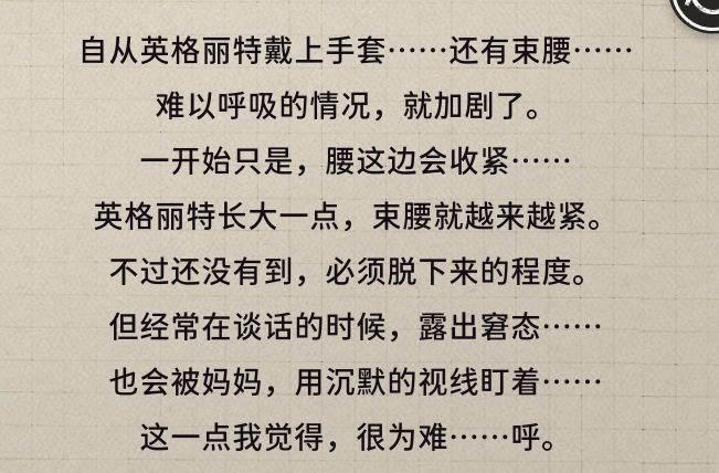 英格丽特说话时呼吸不畅,就是束腰导致的,可见文案是对这一畸形审美持批判态度。