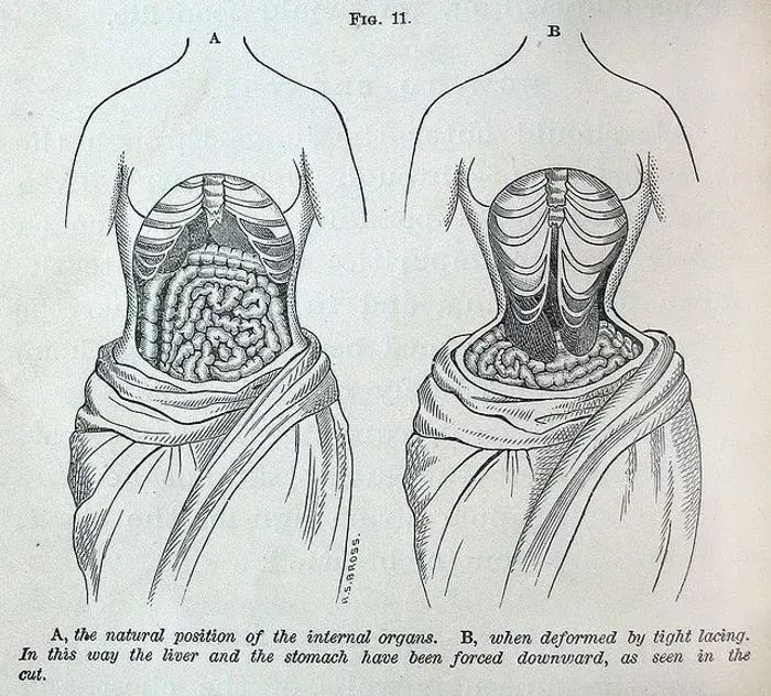 “束腰”由鲸骨、钢丝、藤条等材料制作,会严重挤压胸腹,导致呼吸不畅、血液不流通…甚至致死。
