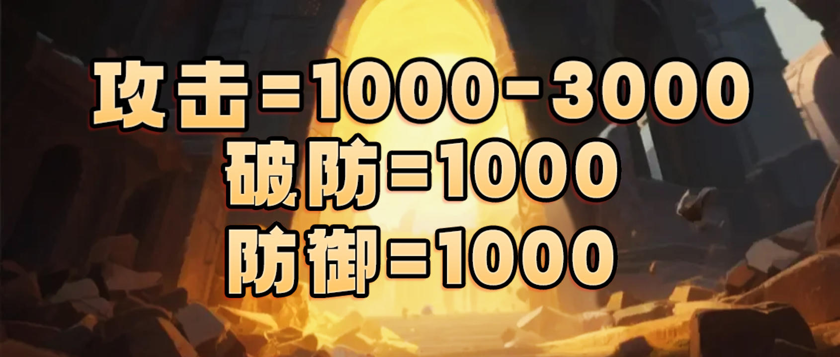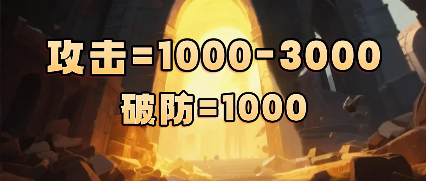 想要增加伤害呢,怪物的防御大多情况下我们是控制不了的,就只能在攻击和破防上下功夫。那么这里就用点小学的乘除法知识了,假设攻击是1,000-3,000,这么设置是因为一般情况下上限是下限的3倍。然后破防是1,000。
