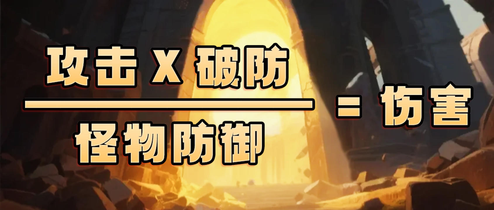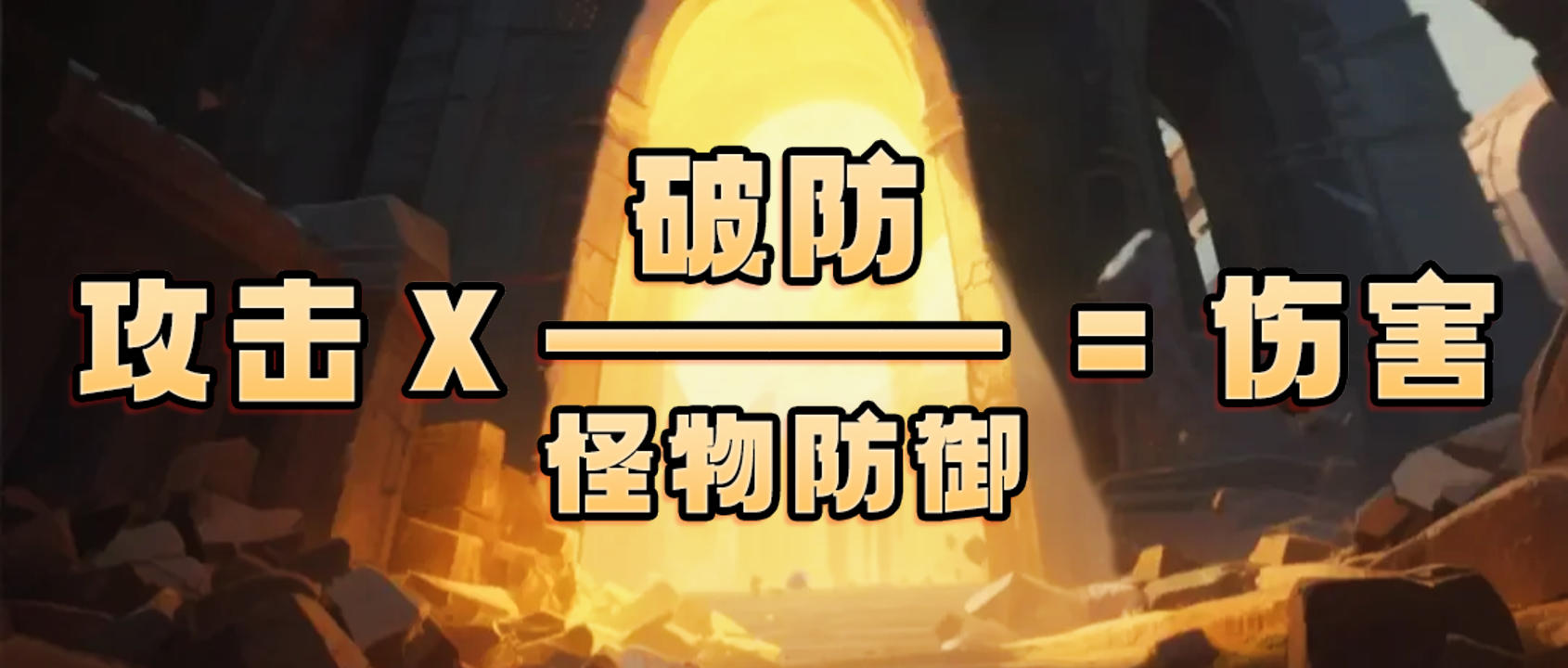 注意啊这个伤害不等于最终的掉血量,只是计算伤害的第一步,之后呢我们还得去乘以各种伤害加成,比如说技能百分比和增伤之类的。但是,这期呢就不用讲这些。我们稍微改一下公式,变成攻击乘以破防再除以怪物的防御等于伤害。