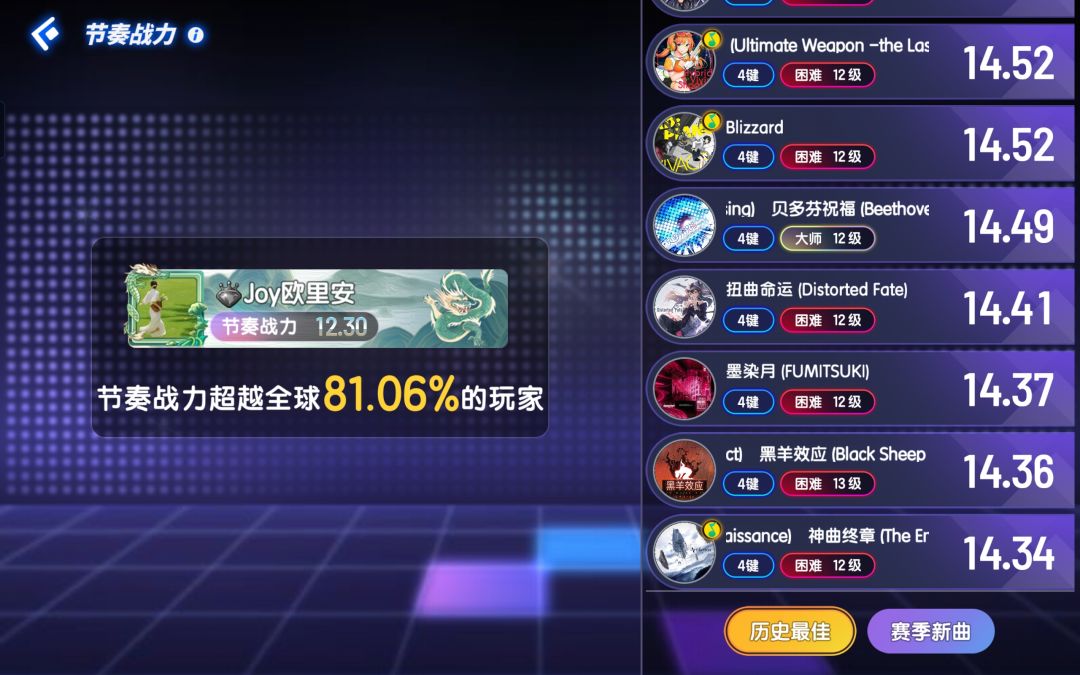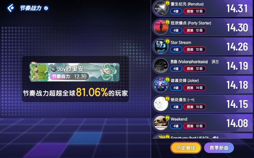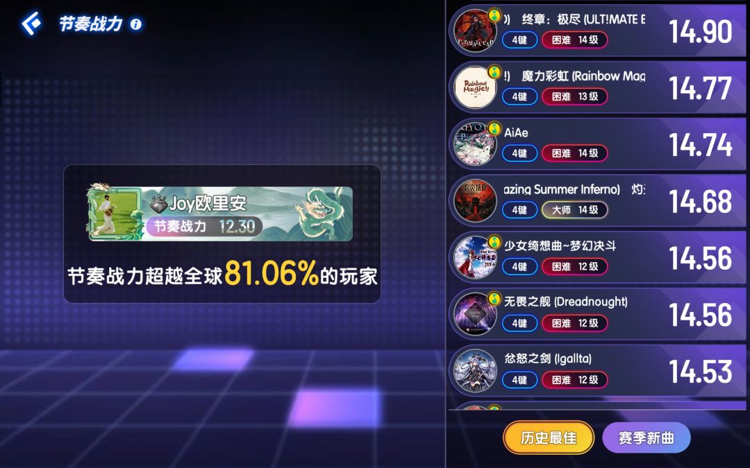 (零氪)节奏大师:节奏战力(当前赛季)11.88(×,假战力无参考价值)+12级SSS评共7首+13级SSS评共2首