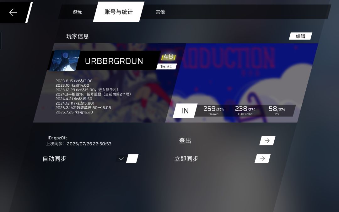 不过,在2024年的3月份时,我的平板因一些变故而被毁,也就是我的初号,当时rks大约是15.20+,后来换了新平板,中间淡坑了一个多月,大约五月份时才恢复到原号水平,到玩phigros一周年时,两个号的游玩总时长也有120h左右(当时rks15.72)……