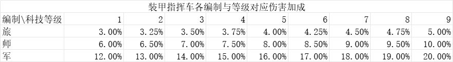 装甲指挥车提供的伤害%,随生效兵种的科技、军官、状态提升会带来更高收益。