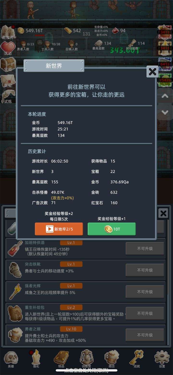 刚开始玩,题材是个好题材,新进的先加群领金砖,金砖别用来买其他东西就氪商店里的勇者之赐。前期就120就开新世界刷点低级宝物。少走弯路