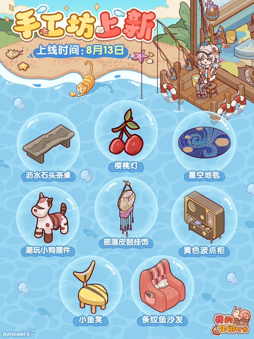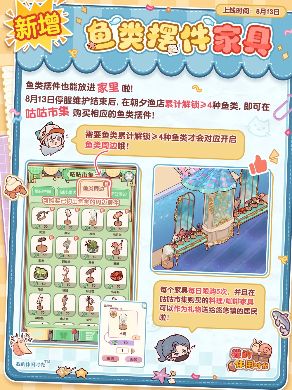 4.🎣8月13日朝夕渔店上新,可在「手工坊」兑换新家具,同时可在咕咕市集购买相应的鱼类摆件家具;