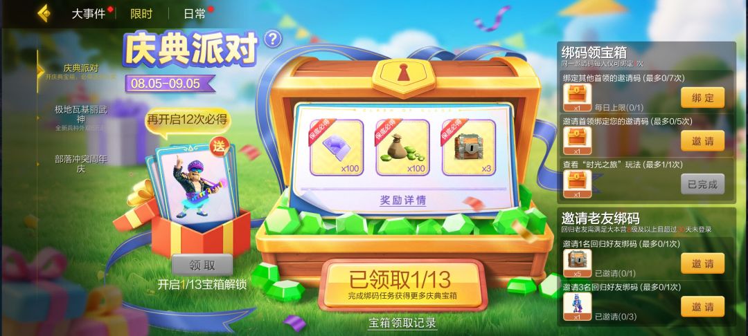 .部落冲突13年周年庆庆典派对开始了 完成任务保底获得100抽奖券 100宝石三个宝箱 还有蛮王的传说皮肤!