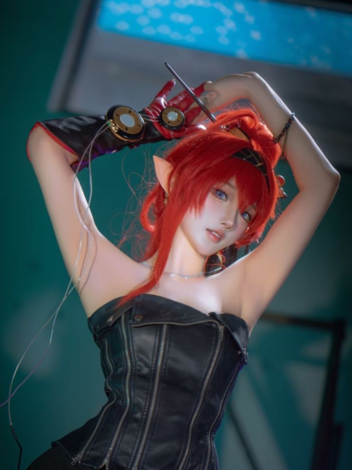 红发高马尾配红色四叶草发簪,黑头巾,品红眼眸带泪痣,着黑金高开衩旗袍配战斗护手,妖冶又飒爽。