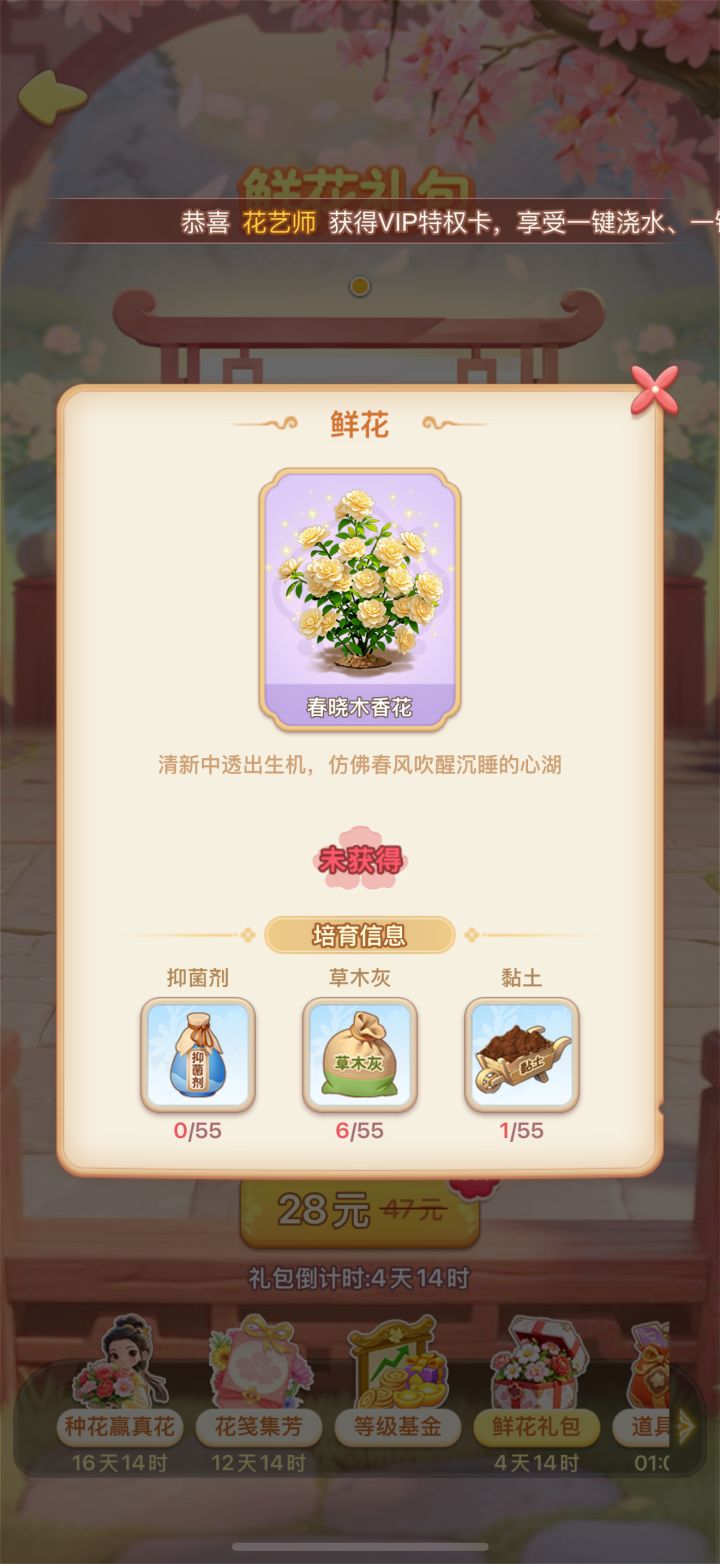 • 增设“超额材料奖励”:若单株培育需求为55个,礼包内材料可设置为 80个(超出需求25个),让玩家“付费即领先”,同时剩余材料可用于后续花卉培育,提升礼包性价比。