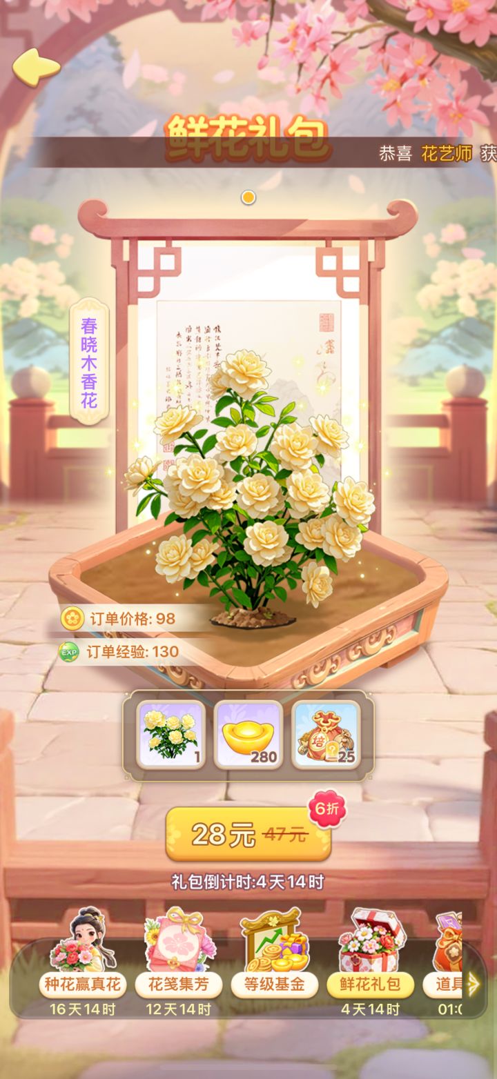 • 调整礼包内容:将培育道具从25个提升至 60个(覆盖单株花卉培育需求的36%→60%),让付费玩家购买后可直接启动培育,缩短“付费→成果”的周期;