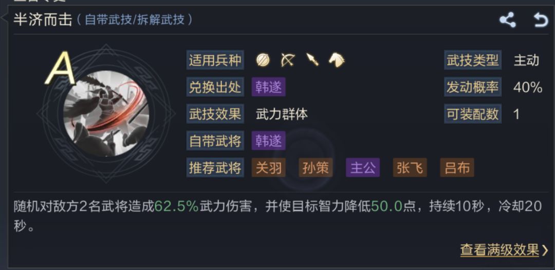 (半济而击)随机对敌方2名武将造成伤害,降低智力(勇冠三军)群体武力伤害,如果目标缴械状态,伤害额外提高百分之30