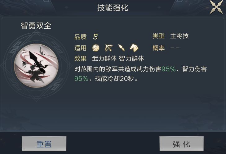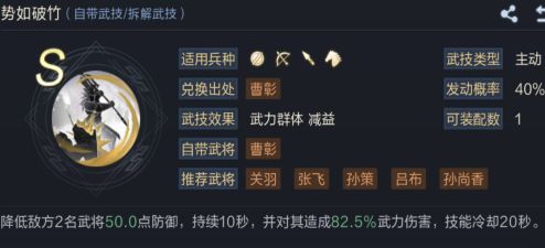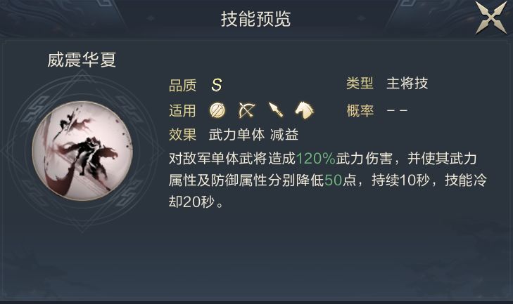 副技能,群体伤害,有概率缴械,无法普通攻击主将技,单体武力,降低敌方武力和防御属性 配搭技能