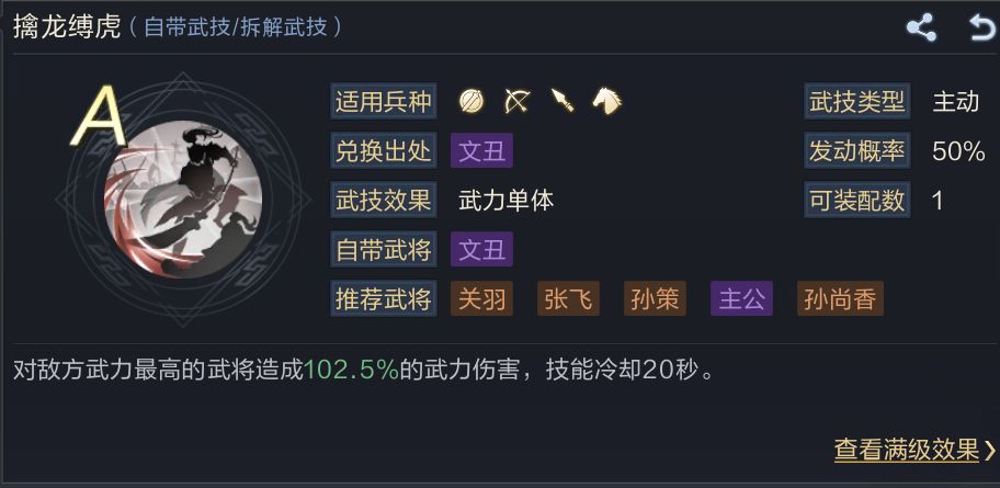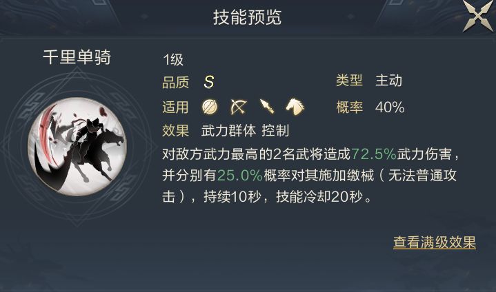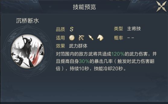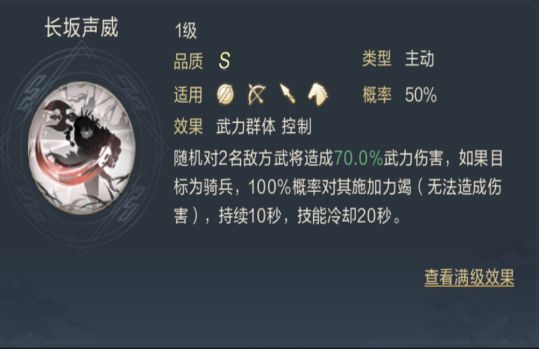 副技能(长坂声威)造成群体武力伤害,如果是骑兵对方百分百无法队自己造成伤害主将技(沉桥断水)群体伤害,并提高暴击百分之30,出发时武力伤害翻倍伤害非常非常的高,技能配搭