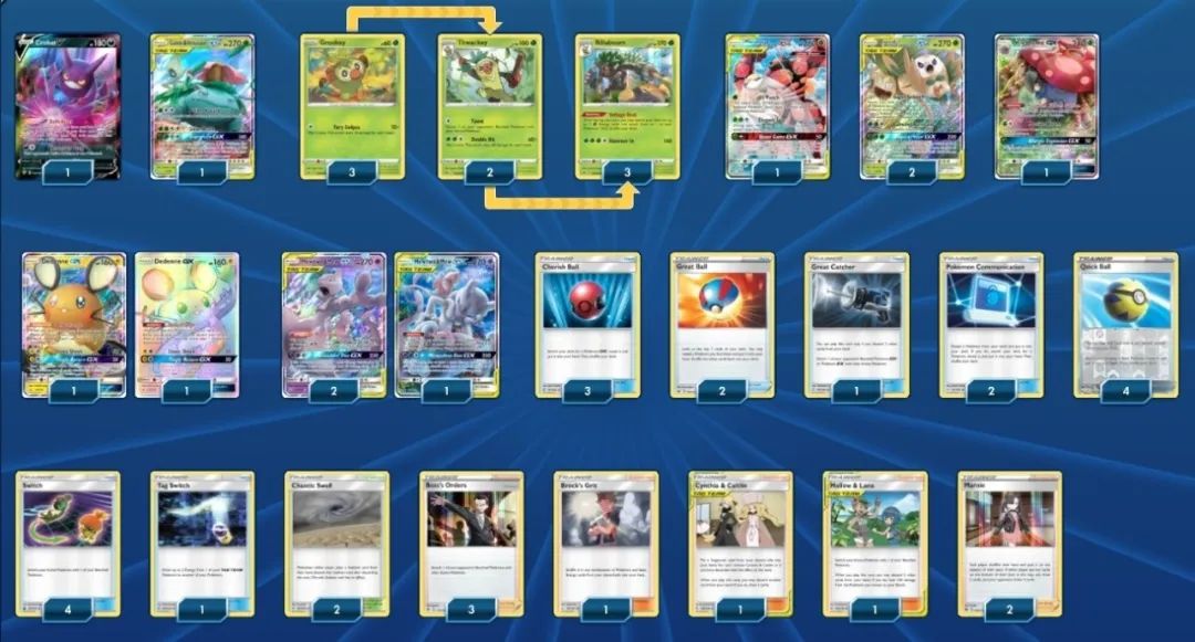 3、遇到高爆发卡组(如苍响、焚焰蚣卡组),在不被秒的情况下,尽量让双梦TT扛伤害,只要不死,就可以用时拉比&妙蛙花的GX招式回满血;