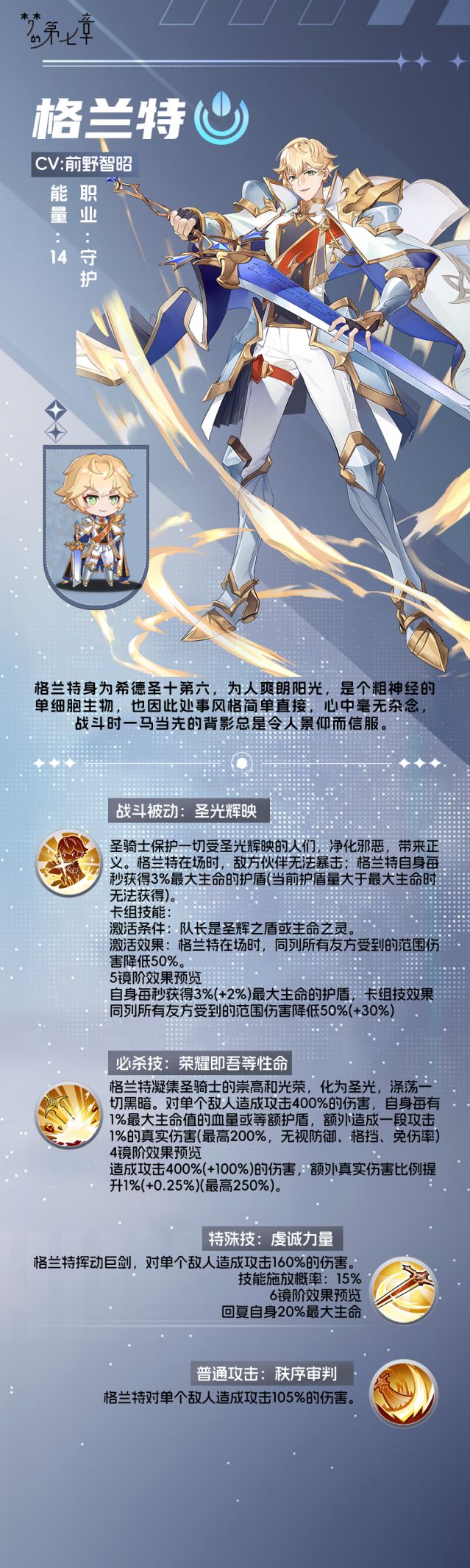 格兰特身为希德圣十第六,为人爽朗阳光,是个粗神经的单细胞生物,也因此处事风格简单直接,心中毫无杂念,战斗时一马当先的背影总是令人景仰而信服。