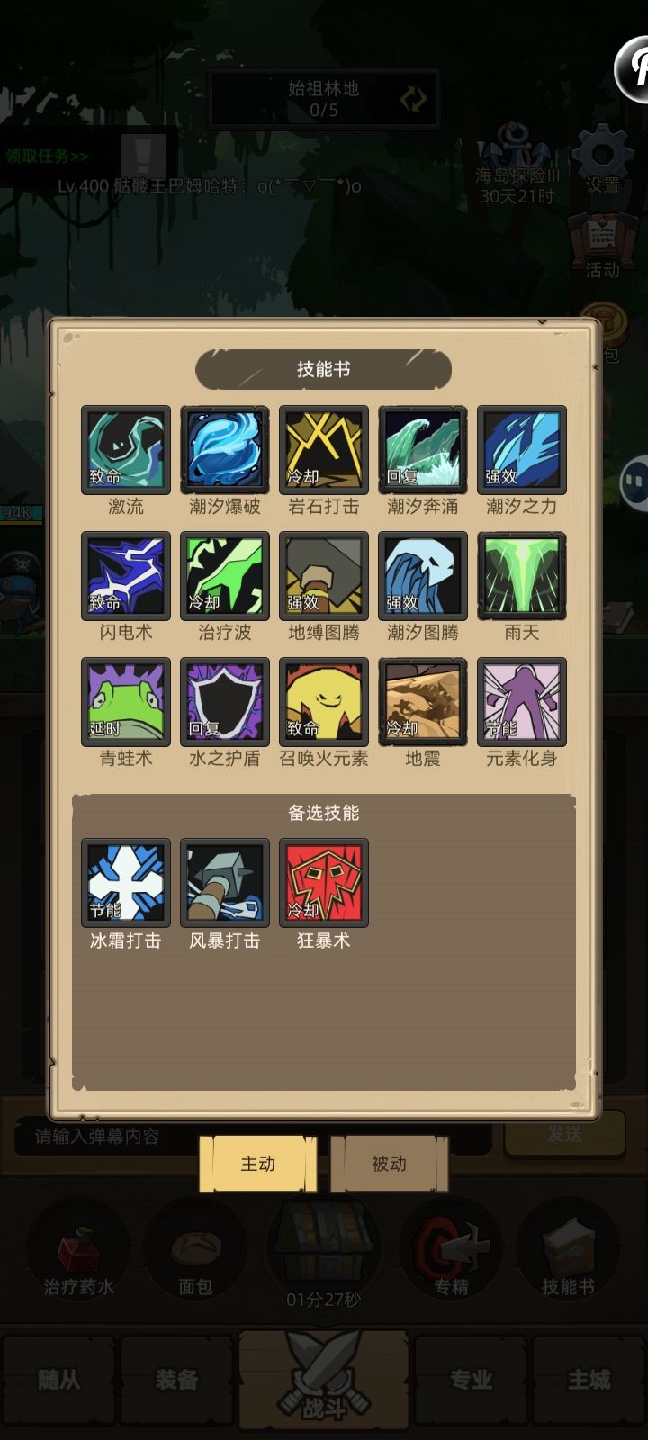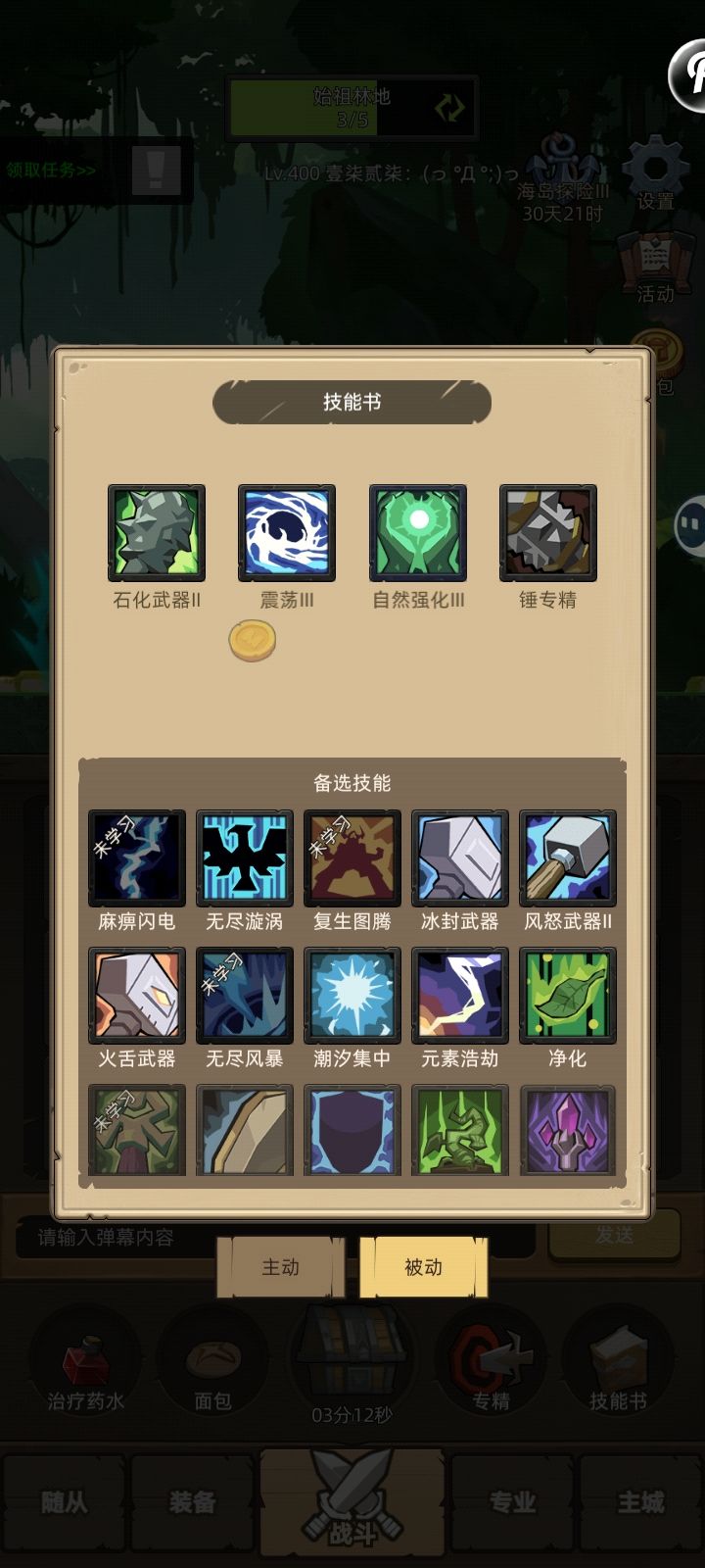 被动,锤专(这样奶萨就有高覆盖率60%的破甲,激流带致命雕纹单技能更是有80破甲,这样也导致奶萨化身收益很低)震荡,石化武器,自然强化(低战力可以带五回,冰封武器,元素浩劫)