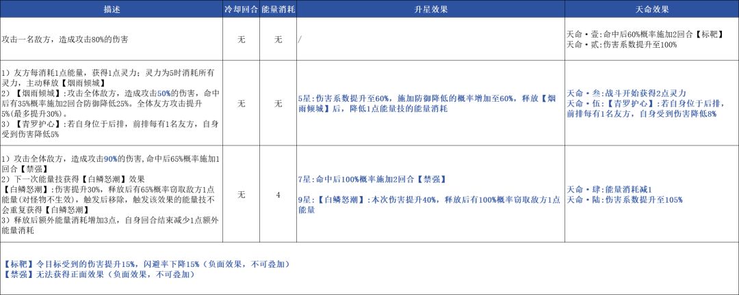 1)白素贞的普攻技概率令目标受到的伤害提升15%,闪避率下降15%;回合技依靠队友释放技能时消耗能量来获得灵力,满灵力时自动释放群体攻击,可降敌方防御、提高我方攻击,位于后排时增加免伤;能量技造成群伤时禁强敌方,每第二次释放时可窃取敌方1点能量