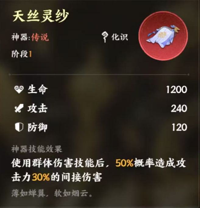 天丝灵纱:暴击率高和神器星级高时可考虑,稳定提高输出