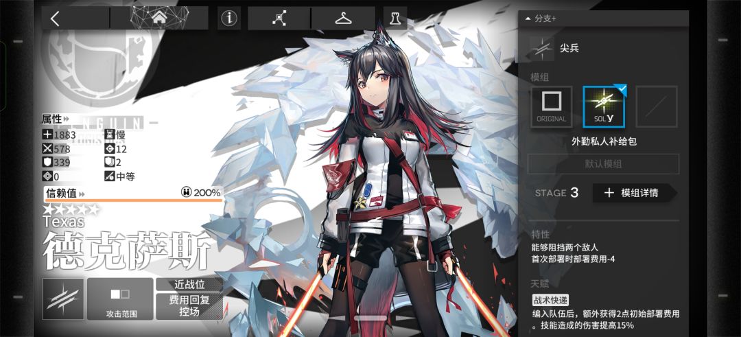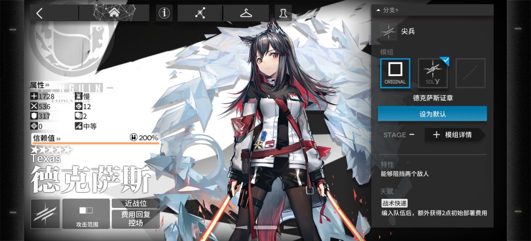 德克萨斯,作为萌新博士拥有的第一个五星尖兵干员,也是我最喜欢的一个干员,首先,我们要知道,德克萨斯她的回费效率是不如桃子的,但是她的优点是可以挂机收菜,所以还是可以练一下应对剿灭挂机,加上免费赠送的光环,还是可以练一下的(虽然目前新出的策士功能性比她强很多)