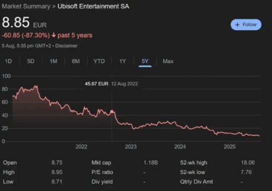 曾几何时,育碧是无数玩家心中的 “创意灯塔”,《刺客信条》《孤岛惊魂》等系列作品构筑了独树一帜的游戏宇宙。但如今,这家法国游戏巨头正经历着成立以来最严峻的危机 —— 过去五年间,其股价从 2022 年 12 月的 45.67 欧元暴跌至 8.85 欧元,跌幅高达 87.3%,近乎腰斩再腰斩,创下公司历史新低。这场断崖式下跌的背后,是创意枯竭、决策失当与信任危机交织的困局。