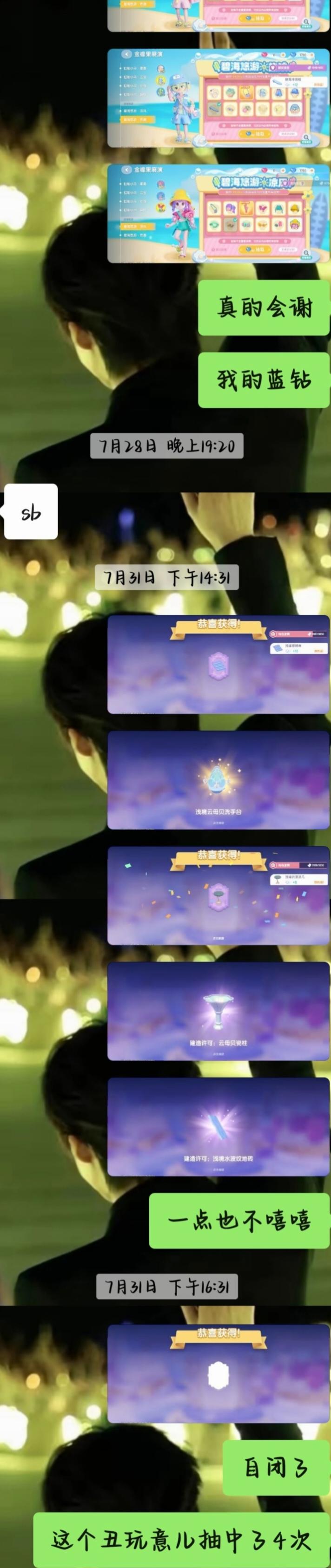 真的是服了无语了,每次这个活动不是抽的,重复的都是小啰喽,再这样下去,真的没有兴趣充钱去抽了!每次抽完我都几天不玩看见就心碎,也或许有可能是我太穷了不是氪金大佬抽不动,我真的不行了……