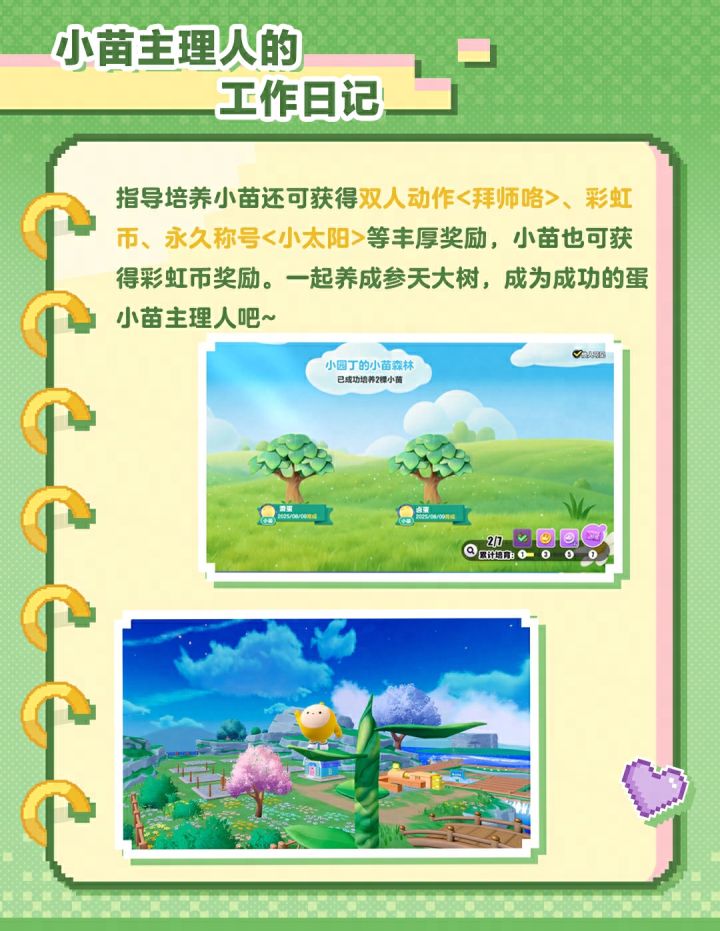 蛋仔农场门前的河流里,将出现一棵小树苗。通过与刚登陆或者回归蛋仔岛的蛋仔结成搭子一起游玩,可以为小树苗积蓄养分,养成参天大树!指导新人小苗蛋和回归漂泊蛋,可获得双人动作<拜师咯>、6枚彩虹币、永久称号<小太阳>等丰厚奖励。被指导的小蛋也可获得2枚彩虹币奖励。期待更多小苗主理人的出现!