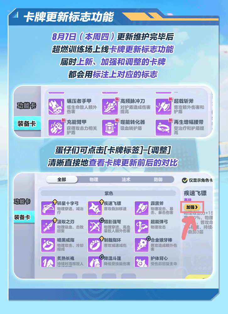 🔥 超燃训练场上线【卡牌更新标识功能】,卡牌的上新/加强/调整情况一目了然,点击相应标识还可查阅卡牌更新前后对比。
