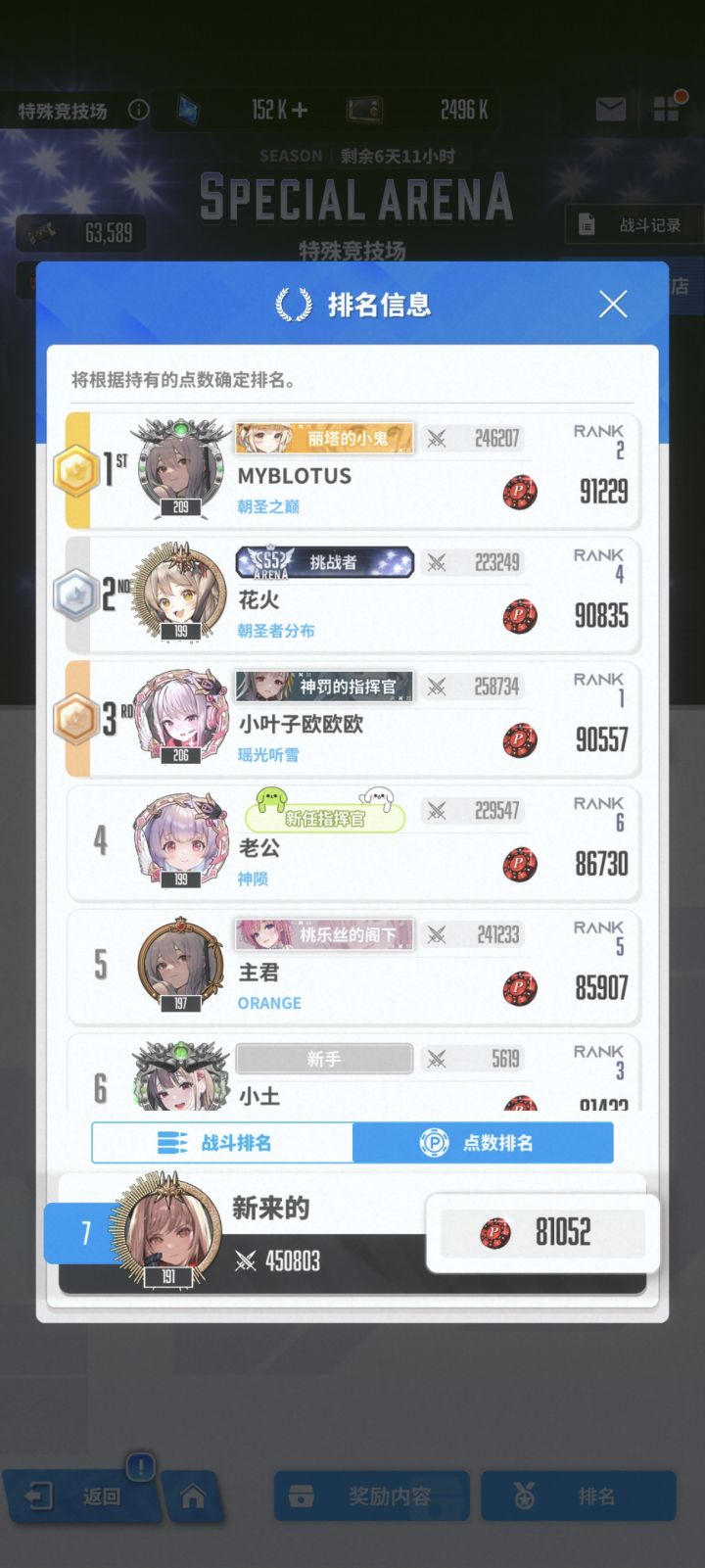 竞技场排名:因为pjjc需要15个人物,现阶段普遍不够,所以只有档次划分,没有排名,而且很宽,和人物综合排名有一定差距。