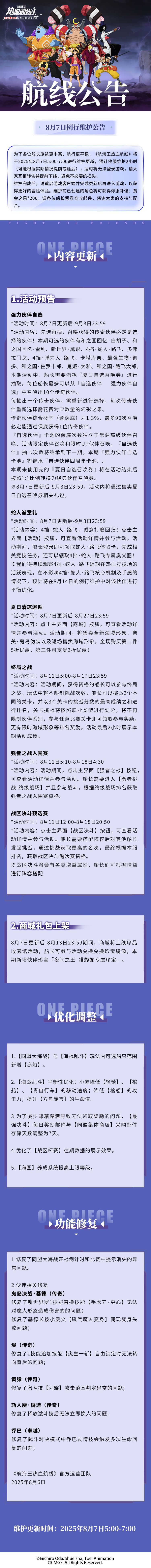 为了各位船长旅途更丰富、航行更平稳,《航海王热血航线》将于2025年8月7日5:00-7:00进行维护更新,预计停服维护2小时(可能根据实际情况提前或延后),届时将无法登录游戏,请大家互相转告并提前下线,避免不必要的损失。