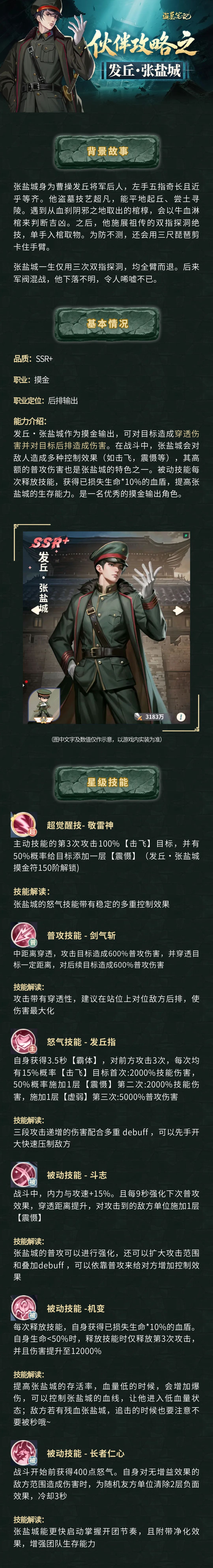 是位后排清理小能手且带有多重控制效果。他精通各式古墓奇诡机关,是稻米们探险阵容里不可或缺的得力助手~发丘・张盐城的限时招募活动马上开启,快来招募这位以双指探洞绝技闻名盗墓界的发丘传人吧!关注我们,后续将会为大家带来更多干货攻略~