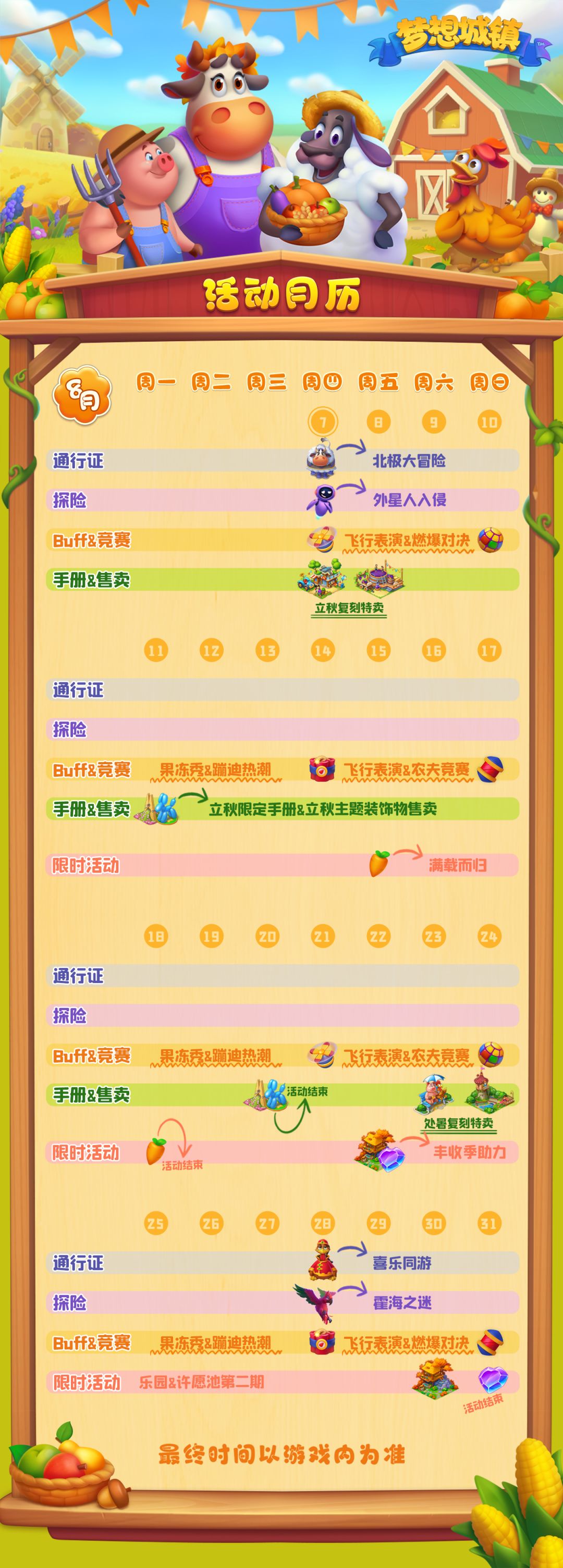 【梦想城镇】丰收季将于8月7日上午10点更新版本,已为大家标注了游戏内活动时间,具体请以游戏内实际活动时间为准喔;