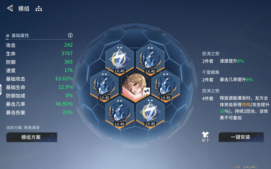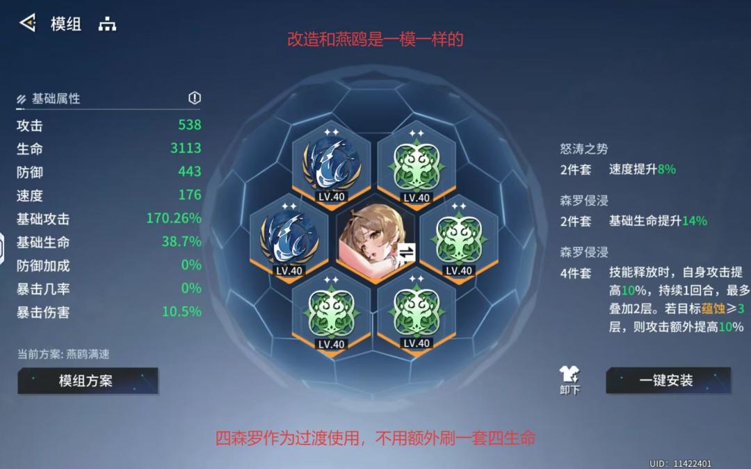 不推荐刷一套满速伤害类模组(平移满速蒂雅套倒是无所谓),非要平移就四怒涛两千雷或者四森罗两怒涛,优先满足暴击攻击速度,不需要高额暴伤(跟蒂雅一样),天赋完全跟攻击和速度挂钩,这两个收益最高。所以话又说回来了,当个辅助绰绰有余,按照燕鸥那一套四森罗/生命+两怒涛完全没问题,双基础速度,改造基础攻击速度。武器赋能有速度就行,先不要花大量资源确定,着急的话就攻击速度加其他(不是很缺生存)。