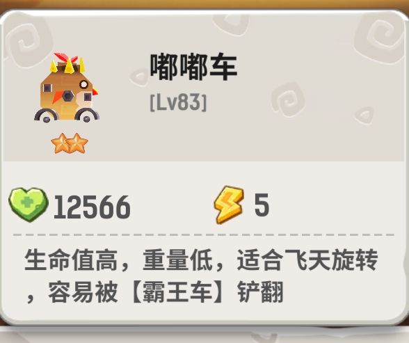 嘟嘟车:不仅具有可以升空的机动性,而且可以在落地后掉头,使得武器生效。这就是不推荐猪猪车的原因。一般选择武器槽和配件槽均≥2的车