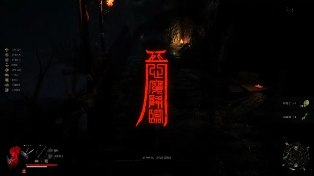 不仅如此,当心魔值达到峰值时,在之前的死亡位置会出现一只心魔,拥有和主角一致的动作模组,会装备随机武器对你攻击,如果被击杀则会完全失去所有的赤汞,但同时也会清空你的心魔点数,击杀则能收回赤汞,并掉落稀有道具;而心魔作为NPC/Boss本身也贯穿游戏的整体流程,你在前期就会看到头戴斗笠,羽化蔓延至脸颊的心魔NPC,而后期重新回到蜀王祠,另一个心魔Boss也会阻止你复活妹妹。而融合了死亡惩罚的心魔系统则让剧情布置中的这些点串联成线,让原本点缀般的NPC布置成为了无常心境变化和轮回叙事的暗线,算是精妙。