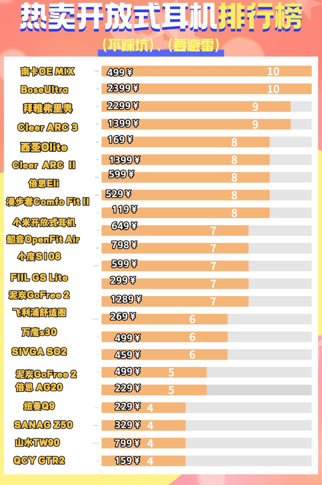 质量上,南卡团队花了1000多个日夜,跑遍多个国家、从3000多种材料和工艺技术的创新组合,选材用料直接对标高端国际奢侈大牌一个水准!耳机每一个生产环节都经过精密设计和严格测试,以保证耳机能够承受各种外部压力和冲击,具备超强“抗衰减性”设计,让耳机使用两年的情况下音质性能衰减不到5%,显著提高了耳机的耐用性和可靠性。Top2、骨聆 SS900 耳机参考价:¥958综合推荐星级:★★★★一句话推荐:微型骨传导振子具备IP68级防水,实为极限户外运动信赖之选。