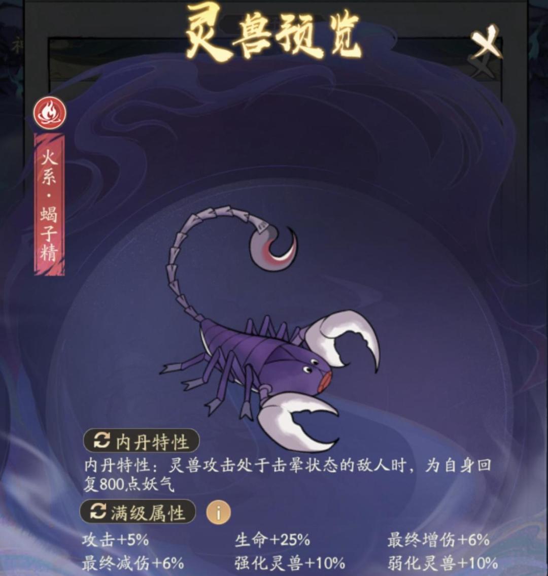 内丹特性:灵兽攻击处于击晕状态敌人时,为自身回复妖气。