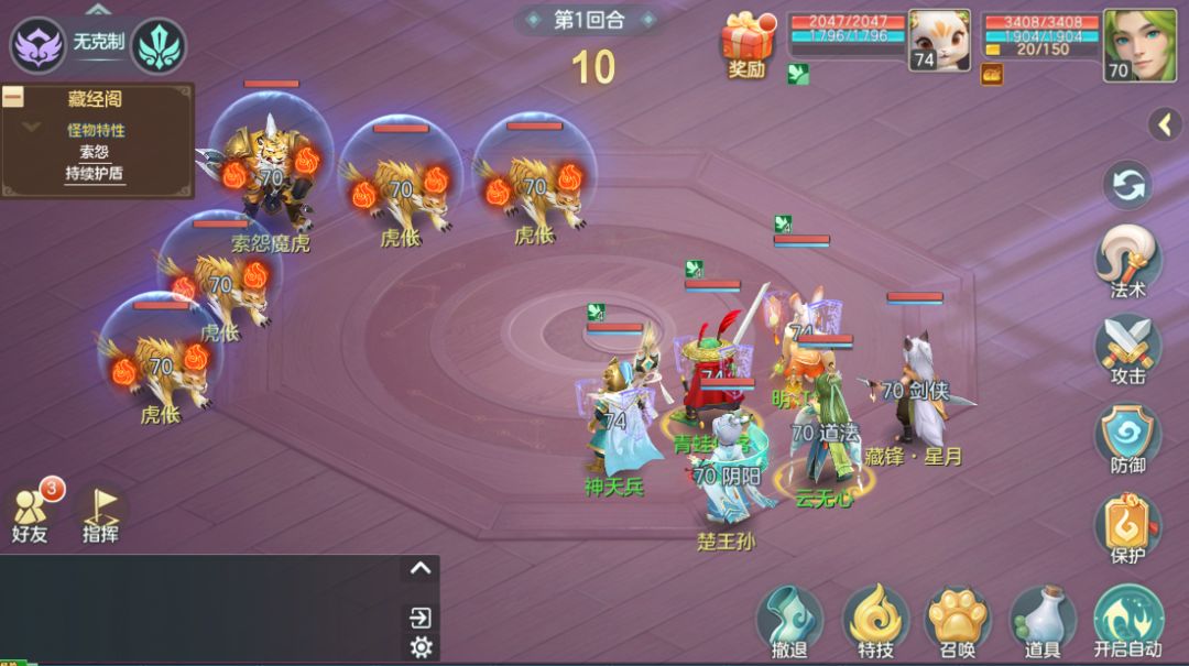 进入镇魔塔玩法中,少侠最多可以同时上阵2个伙伴和3只宠物进行战斗。
