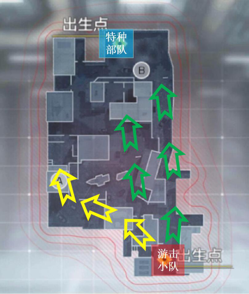 绿色进攻路线:进攻B点最大的困难在于需要经过危险重重的中路,以及有利于敌方狙击手卡点的辅道。进攻时为了避免被敌人发现己方意图,需要借助烟雾弹的辅助,否则可能会损失惨重。