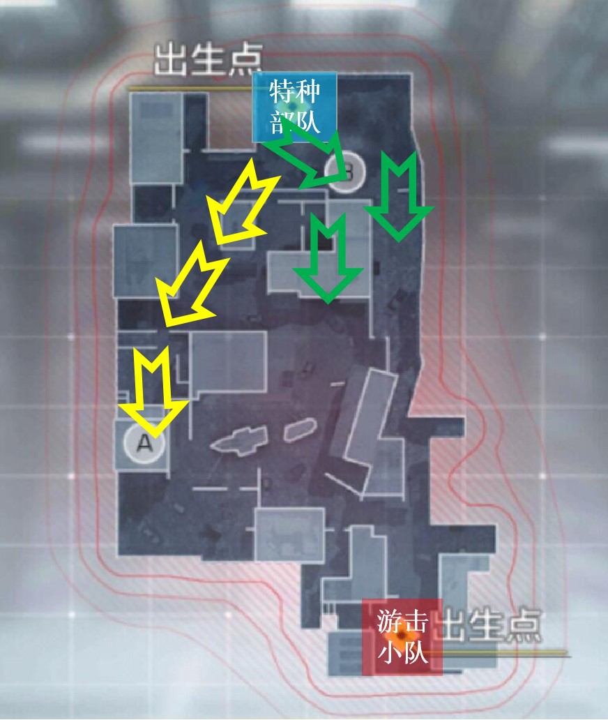 黄色防守路线:开局后特种部队可直接前往天台楼院子。抵达天台楼院子后可在捷径或者木楼梯阻挡企图从破楼方向进攻天台楼的敌人。