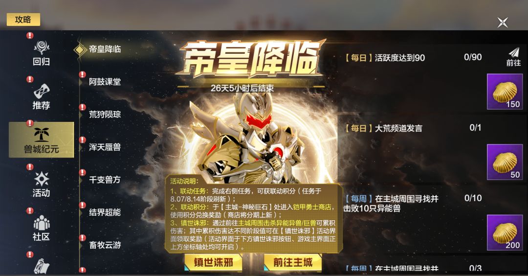 为了让大荒众生回归安稳,山海管理司和帝皇侠联合发布了活动任务,并为完成对应活动任务的旅者送上活动积分,用于兑换奖励。