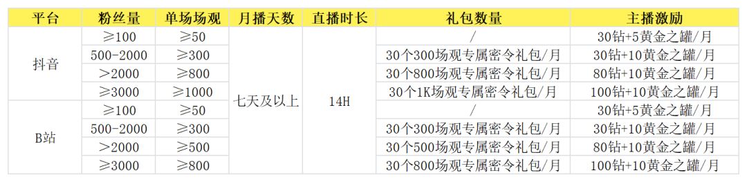 招募方式:通过评论区/公众号私信参考以下形式填写招募令,通过后即可开播,在对应平台开播后达到场观可申请专属密令赠予直播间粉丝!(未达到场观的主播不能申请专属密令礼包,但达到开播时间时长仍可获得主播月度激励)