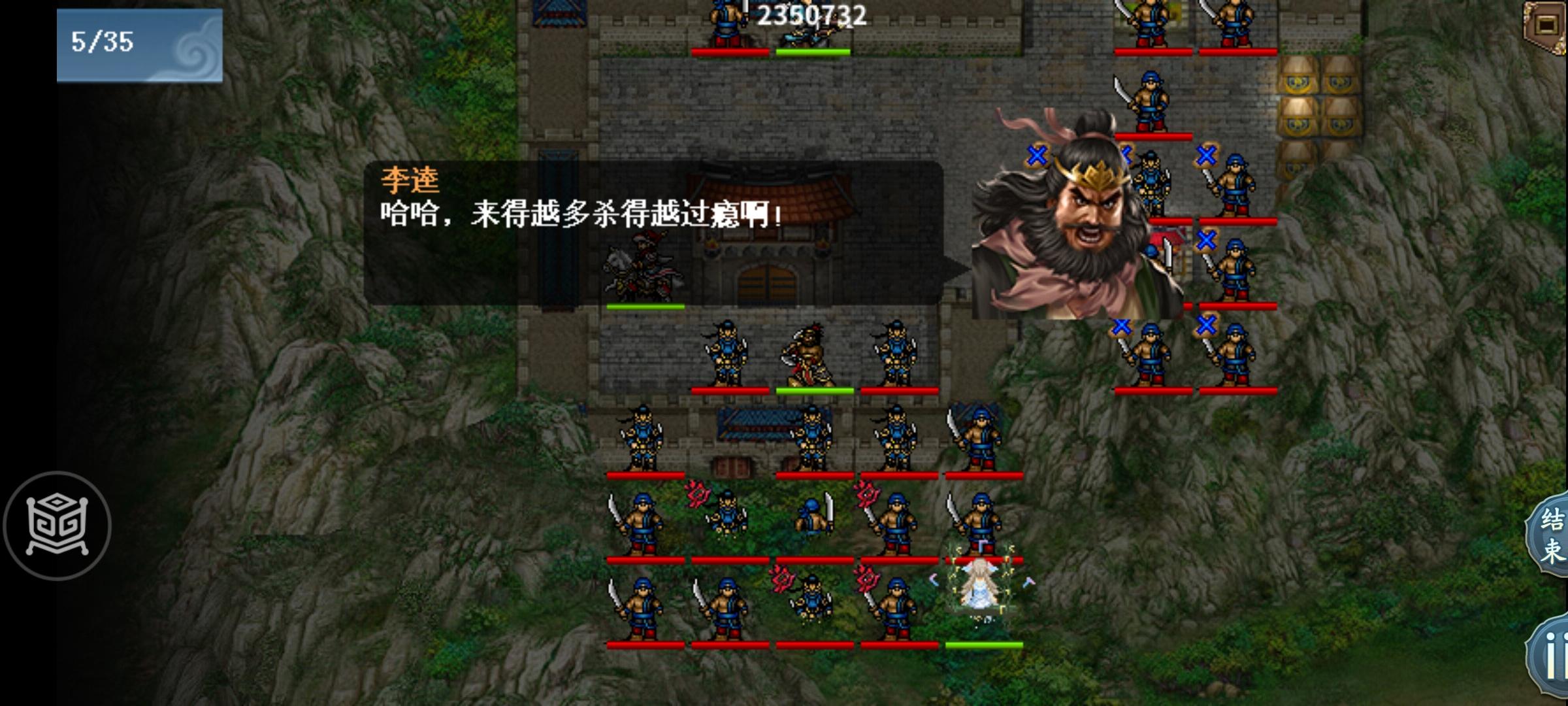 开局选2杀了,分两边走,两个一组向左有人过了(19.26)就会出来7个敌军且会混乱加麻痹,速度清完,上路过了(28.18)跟左边的一样速度清完兵之后左边的在10.17或者上路的 19.13又出来7个敌军干就完事,剩下5人以下触发剧情,李逵在下边城门口,燕青在上边城门口,同时城里的敌军都是混乱状态清的剩下5以下又出来一批敌军速度清完,鹿砦有雪莲,给个人站在(15.5)触发剧情就过关了