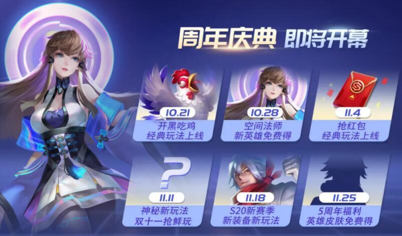 离五周年庆典还剩五周,周年庆版本将免费送新英雄和皮肤,同时在接下来的时间里还将有新英雄免费拿、开黑吃鸡、抢红包等经典玩法上线,新的赛季皮肤也即将揭晓,更多福利和好玩的内容见游戏内“五周年倒计时”页签。