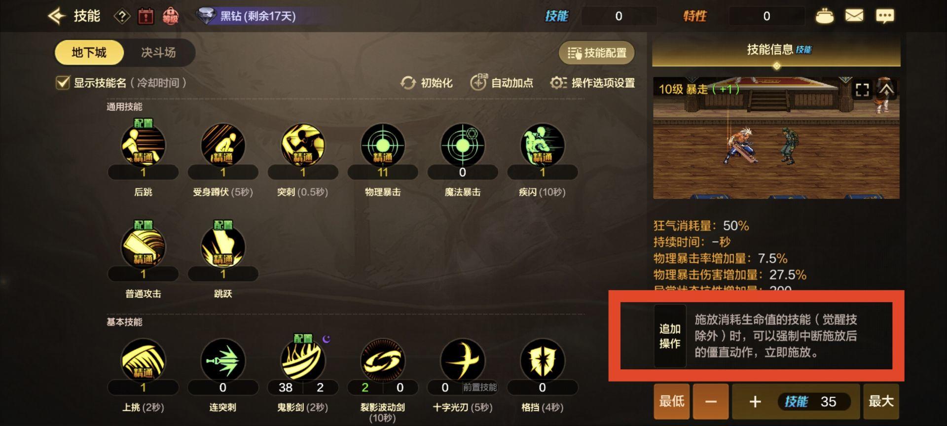 ②学习狂气旺盛后,技能命中敌人时,可立即中断并使用其他技能;注意!!!鬼斩一定要命中敌人后才能够强制中断衔接其他技能!!!