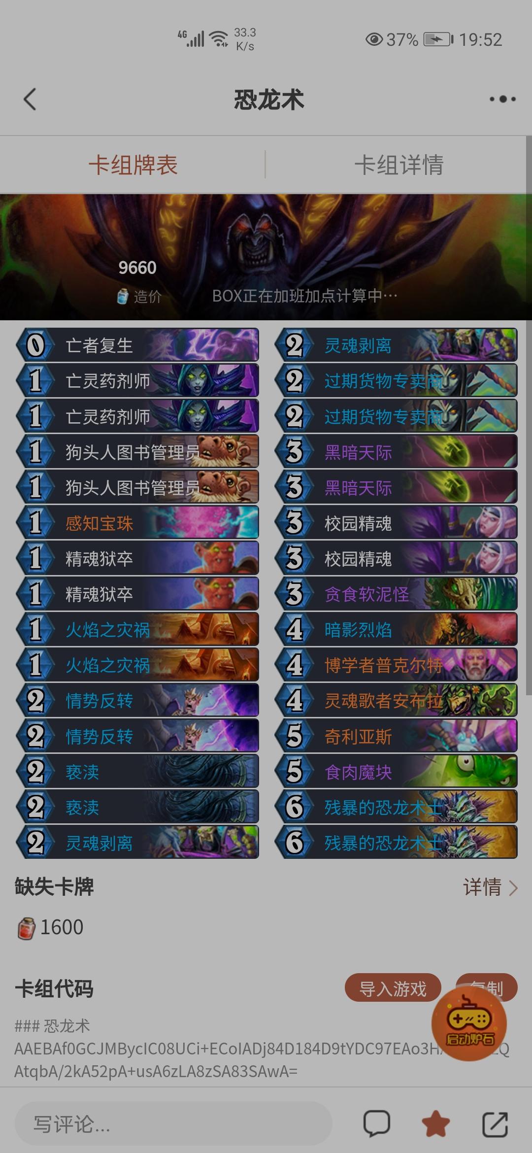恐龙术连胜上钻石(白金5出发),这套娱乐卡组还是可以的,我在我上个帖子的基础上将一张亡者复生换成了发牌员,但是我同时也发现发牌员会带来一个坏处(个人认为):这套带碎片体系的目的就是抽到保命,排列之后碎片沉底反而违背本意,加上由于恐龙术特性,所以解牌都是低费的,因此可能造成拍下发牌员后下回合如果对面展开小波场面我们短时间内无法处理的情况,加上碎片沉底很容易被抢死,总之我可以连胜至少说明了恐龙术在月末环境强度的合格性,但是有待改进,还是一个偏娱乐的卡组